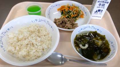 今日は、今年度初めての水泳をした(これからする)という子どもたちなので、スタミナ料理のビビンバはうれしいですね。手作りメロンソーダゼリーは、サイダーゼリーから変更になりました。今日の手作りゼリー、プルルン具合が素晴らしいです。
