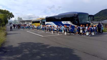 本日、3年生は、お弁当、おやつ、水筒を持って、2台のバスに乗り込み、市内巡りの旅に元気いっぱい出発しました。8:30〜15:00頃まで、三豊市中(海から、市街地、山まで)を旅します。まあ、遠足ですね。本校は、春の遠足は行っていませんが、秋のバスで行く遠足以外に、校外学習(遠足)に、学年ごとに1回は行くようにしています。