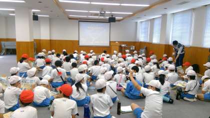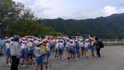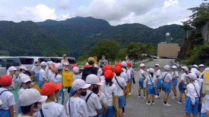2時間弱で、早明浦ダムに到着しました。バスの窓から見えた大きなダムに子どもたちは大興奮です。ホールに入って、これから早明浦ダムについての説明を聞きます。