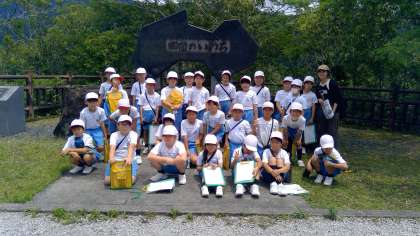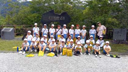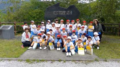 クラスごとに記念撮影です。記念撮影が終わったら、昼食場所のすぐ近く「クライミングセンター」に移動します。