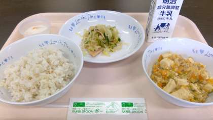 昨日は、4年生の早明浦ダム見学に行ったので、このところのマイブームである「きのこ和え」を逃してしまったのですが、今日は、麻婆豆腐です。とてもうれしいです。実は、私、麻婆豆腐は、中華料理屋さんに行っても、家でも進んで食べたいと思う料理ではないのですが、本校の給食の麻婆豆腐だけは、なぜか大好きなのです。時々、「家では食べないのですが、給食の○○は、おいしいと言っています。」という保護者の方の声を聞くことがありますが、全く同じことです。入っている食材が違うのでしょうか?それとも味付けでしょうか?もしかして、料理の仕方なのでしょうか?私は、ちょっと和風に感じます。