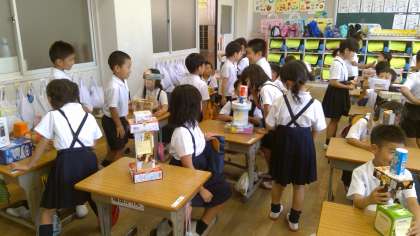 図工の箱と箱を組み合わせてで作った作品を松、竹組でお互いに見に行きました。友達の作品を見てすごい、上手、かっこいいね、などお互いの作品を認め合う素敵な言葉が飛び交いました。作品作りにも頑張れるし、作品のよさも見つけられるスーパー1年生です。
