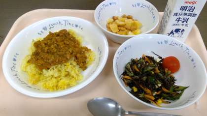 本日は、4年ぶりの「1年生親子給食」です。ですから、メニューも伝説の「ドライカレー」です。お父さんやお母さん世代も、きっと、学校給食で「ドライカレー」が出て、おいしかったという記憶がある方が多いのではないでしょうか。