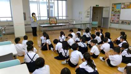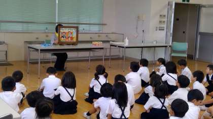 朝の時間に、交通安全母の会の三木様が、子供たちのために交通安全の紙芝居をしにきてくれました。
