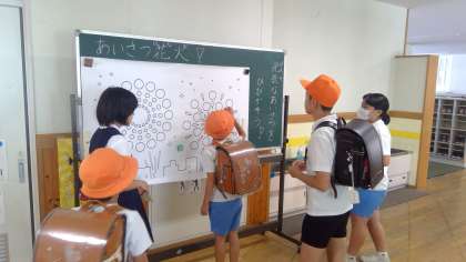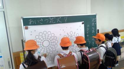 今週は、「あいさつ週間」です。生活委員さんが、児童玄関であいさつができた子に、カラフルなシールを渡しています。シールは、花火の下絵に貼っていきます。花火の完成を目指して、いや、本校のあいさつの「花火」をドーンと打ち上げるために、全校児童が取り組んでいます。
