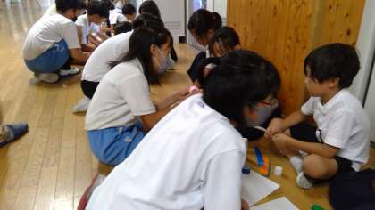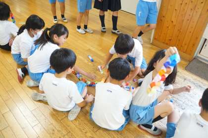 そして、次は場所を廊下や教室に移動してメインイベントの「輪飾り作り」です。1、2年生は6年生のお兄さんやお姉さんと一緒に作りました。隣の人の輪っかとくっつけ、それをまたつないで、1階、2階、3階で長い輪飾りができました。