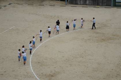 それを、6年生が慎重に運動場に運び出して全校児童が出てくるのを待ちます。心配された雨も子どもたちの熱気が引き飛ばし、雨もぱらぱら降ったりやんだりの状態でした。