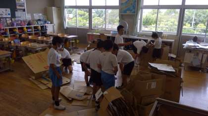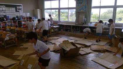 さあ、いよいよ明日は宿泊学習です。明日の宿泊に向けて寝床づくりをしています。段ボールを組み合わせて…、机を使って…と知恵を出し合って、快適な寝床をつくっています。明日への期待がどんどん高まっています。