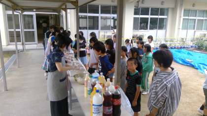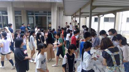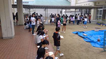 夕食の時間です。夕食は、カレーライスとジュースとアイスキャンデーです。いつも見慣れた体育館前ですが、夕暮れ時にみんなでカレーライスを食べるとなれば、また雰囲気が違いますね。