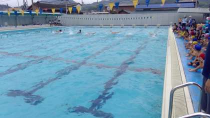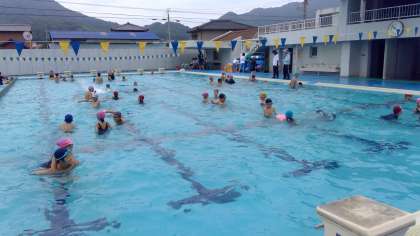 今日の2時間目に1年生と6年生が一緒にプールで交流しました。1年生が練習している顔付けやだるま浮きを一緒にしたり、けのびの見本を見せたりと上級生らしい姿を見せてくれました。また、1年生をおんぶしたり、手をつないでプールで過ごすことができ、6年生もとても楽しそうにしていました。最後に、6年生の代表の人が、クロール、平泳ぎ、バタフライの泳ぎをみんなに見せてくれました。大好きな1年生と素敵な時間を過ごすことができました。