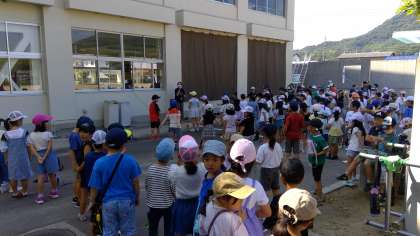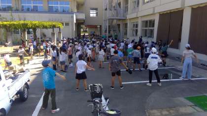 うらしまキッズでは、夏休みの朝は、校庭(図工室の横の陰)で朝の集会、ラジオ体操を行っています。とても元気です。たくさんの子どもたちが、挨拶をしてくれました。