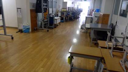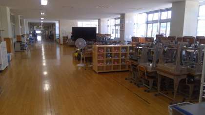 夏休み中に、教室の床のワックスがけをするため、教室の中の机などを廊下に出しています。廊下が極端に広い本校でも、こんな感じになっています。全校登校日には、教室の床はピカピカになっていると思います。