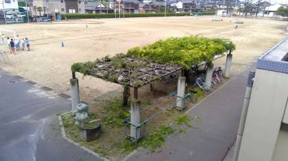 藤のツルが伸びに伸びています。今朝、全体の40%くらいを刈り込みました。ちょうど、うらしまキッズや陸上の練習の子どもたちが登校する時間帯だったので、棚の上から、挨拶ができました。残りは、また、後日にがんばります。