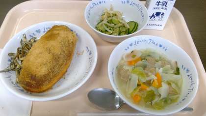 今日から2学期の給食が始まります。初日のメニューは月曜日なのでパンです。なんと「きなこ揚げパン」です。栄養教諭も調理員もスタートからアクセル全開のメニューですね。本校の調理のモットーは、「温かい物は温かく、冷たい物は冷たく!」だそうですので、(11:30の時点で)もしかしてまだパンを揚げているのではと思ってランチルームの窓から見てみますと、釜の油の中にパンがたくさん浮かんでいました。この暑い中、揚げパンは厳しいかと推察しますが、私たち(私はもちろん、たくさんの子どもたちが「今日は揚げパンやで、楽しみ!」と言っていました。警報が出て学校が休みにならなくて本当によかったです。)にとっては、とてもうれしいメニューです。いや最高です。ありがとうございます。きゅうりのナムルは、夏バテに効きそうです。暑さのストレスを小魚アーモンドが癒してくれそうです。肉団子、優しい味で野菜たっぷりで、とてもおいしいです。給食の味が戻ってきましたね。