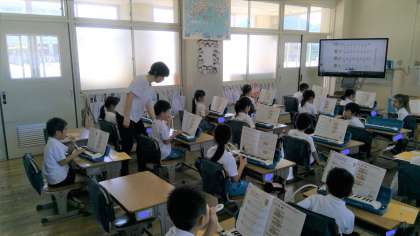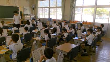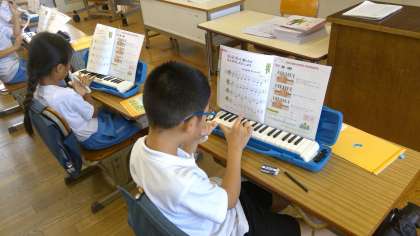 本日の4時間目。2年竹組さんは音楽の授業です。机の上に鍵盤ハーモニカを準備しています。輪唱で有名な『かえるの がっしょう』を演奏しています。