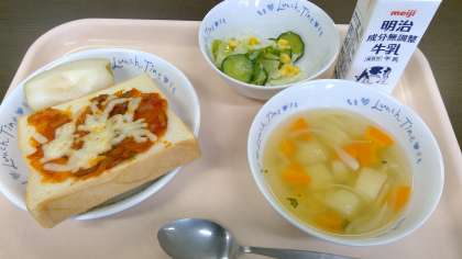 「キャベツときゅうりとコーンのサラダ」に名前変更した方がいいと思うほど、きゅうりの存在感のあるサラダ。小学生の時、「梨がなし(無し)になった!」とだじゃれを言って、めちゃくちゃ先生に叱られた思い出の梨。昔は、先割れスプーンで芯の部分をくり抜いて食べなければならないのに、めんどうだからそのまま食べて、めちゃくちゃ苦くてすっぱい思いをした梨。アルファベットのパスタより、やわらかいのに角が残っている(エッジのある)じゃがいもが目立つABCスープ。私が子どもの頃の給食は、嫌と言うほどパンばかりだったのに一度も出たことがないピザトースト。