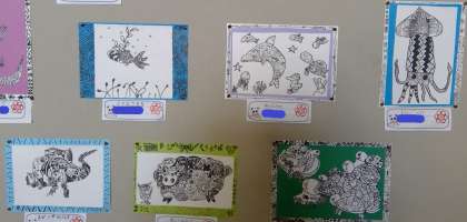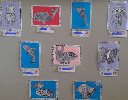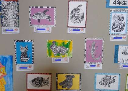 階段の踊り場に掲示してある4年生の作品です。とても細かい線がびっしりの作品ですので、ぜひ、参観日に近くでご覧ください。どの作品なのかは、お子様にお聞きください。(本日の午後、9月12日の写真集でも写真をアップします。)