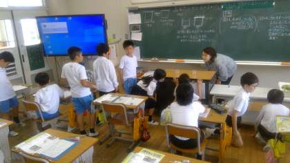 本日の2時間目。4年梅組さんは理科の授業です。今日は「自然の中の水のすがた」のお勉強です。4梅の皆さんは、朝、ぬれたタオルの重さを計測していたそうです。その時の重さは74グラムだったそうです。それを干しておいて、この時間に計測してみると39グラムになっていました。これは、タオルが乾いたからで、その乾いた分の水の重さだけ軽くなったのだということが分かります。では、水はどこに行ってしまったのでしょうか?