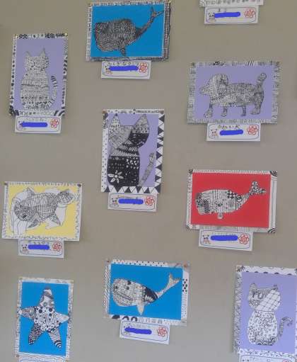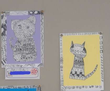 4年梅組教室に掲示してある図工の作品です。とても細かい線がいっぱいの作品ですので、参観日にぜひ近くからご覧ください。どの作品なのかは、お子様にお聞きください。