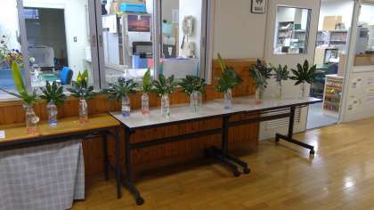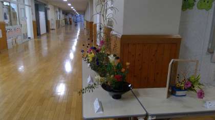 ○玄関(事務室前)には、お花クラブの児童の作品展示をしております。ぜひご覧ください。