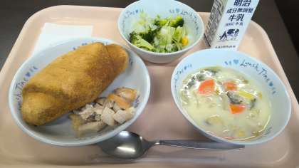 今日は、「きな粉揚げパン」です。私たちの世代の者も「揚げパン」=「なつかしい・おいしい」という思いの方がほとんどだと思います。中学校を卒業したら、自分で求めない限り揚げパンを食することはありませんからね。定期的に揚げパンを食べることができる幸せを、私たち教職員はもっと感じなければなりませんね。