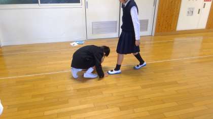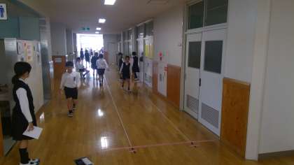 算数の時間に、平均の考えを使って自分の歩幅を求めました。まず、10歩分の距離を計測し、それを5回繰り返します。次に、その5回分の距離を合計して、5で割ります。最後に、その長さを10で割ると歩幅が出るという計算です。班で協力して活動することで、学びを生活と結び付けることができました。