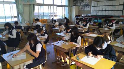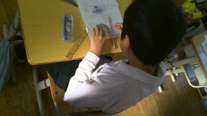 本日の1時間目。3階に行きますと、多目的スペース(広い廊下)で5年生が学習発表会の練習をしていました。その声が時々響く6年竹組教室に入ると、シーンとした教室に、鉛筆やコンパス、分度器、定規を使う音だけが聞こえてきました。算数のテストをしているのですね。「表を使って考えよう・図形の拡大と縮小」の単元のテストだからです。