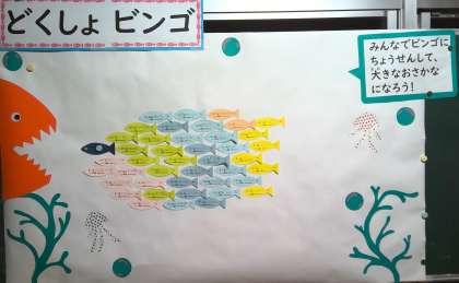 児童玄関の横に、こんな掲示が登場しました。「読書ビンゴ」を達成した人が、小さなお魚を増やしていきます。さて、この後、どうなるのでしょうか?