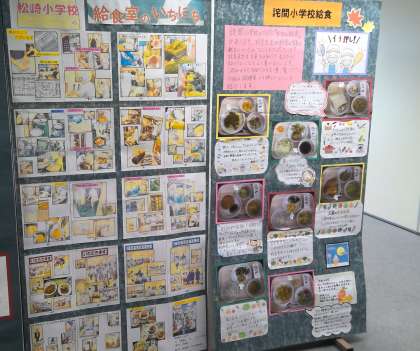 また、給食調理場(詫間中・詫間小・松崎小)の展示もあります。まだ、見に行かれていない方は、ぜひどうぞ。給食のメニューの紹介もありましたよ。
