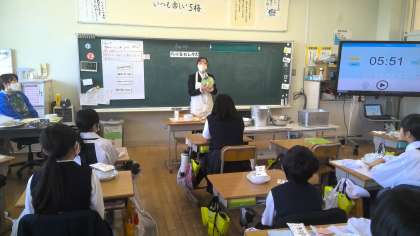 今日は、給食の時間に5年梅組におじゃましました。栄養教諭の教育実習に来ている宮下先生(子どもたちは「ひまわり先生」と呼んでいる)が5梅で一緒に給食を食べて、その後、給食に関するお話をするようです。
