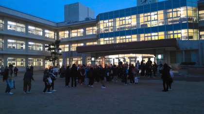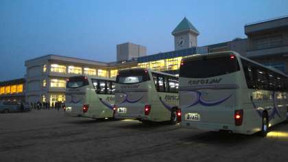 集合時刻が近づきました。どんどん、子どもたちが集合しています。バスも3台、到着しました。修学旅行気分がぐんと高まっています。だんだん、明るくなってきました。