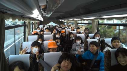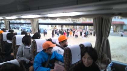 予定通り、午前7時頃、お家の方々に手を振って、学校を出発しました。各クラス10人ずつ、3台のバスに分かれています。