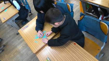 配られたストロー(棒)を「10のかたまり」を作って並べていきます。ペアのお友達と協力してがんばっています。