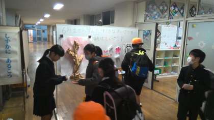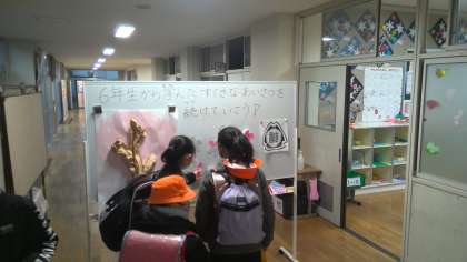 今月も、生活委員さん、児童会役員さんによる「あいさつ運動」が始まりました。今回は、「あいさつをして、シールをもらって、6年生に感謝する素敵な掲示物」を完成させるという取組のようです。今朝は、久しぶりの本格的な雨の朝となりました。登校するのは大変だったと思いますが、あいさつ運動にがんばってくれていました。