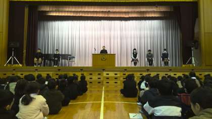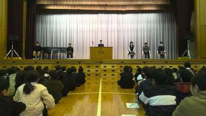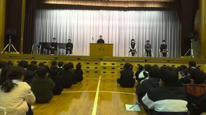 本日の全校集会では、新しい児童会役員を決める児童会役員選挙の立候補者の演説会が行われました。立候補して5年生の中で選ばれた6人の候補者が、堂々と自分の考えを述べました。