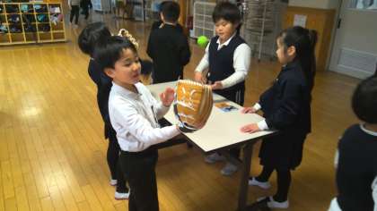 大谷選手からプレゼントしていただいたグローブですが、各学級を回しています。ただ、なかなか時間がかかるので、本日と明日の昼休みに、2階の多目的スペース(3竹教室前の広い廊下)で、早く見たい、触ってみたいと思っている子どもたちに、グローブと香川オリーブガイナーズからいただいたボールを公開しています。