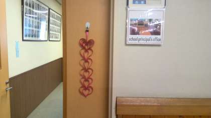校長室の鍵を開けながらふと見ると、「節分」の飾りから「ハート(いっぱい)」の飾りに変わっていました。きっと、「鬼は外、福は内!」と豆まきをしたので、福(ハート)がいっぱいやってきたのだと思います。今日は、授業参観。子どもたちもそうでしょうが、私も楽しみでワクワクしています。まさに心の中は、ハートだらけです。
