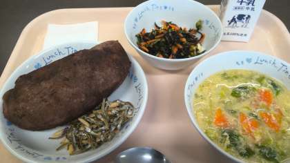 本日は、解説の必要がありませんね。「今日の給食、ココア揚げパンなんで!」、「そうや、知っとるわ!」、「楽しみやなあ!」、「おかわりのパンあるかなあ?」などと会話している子どもたち何組かに出会いました。私は、ずっと前(「2月の給食献立表」を見た時)から楽しみにしていました。口のまわりをまっ茶色にしながら、いただいています。