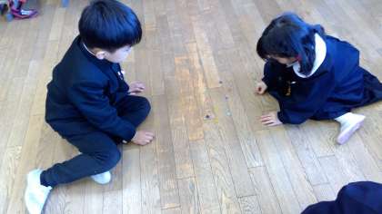 先週の金曜日、ぽかぽかお天気の中、芝生広場で竹とんぼと羽根つきをしました。はじめてした子が多かったのでですが、遊んでいるうちにコツをつかみ、お互いに見つけたコツを教え合い楽しく遊びました。今日は、教室でおはじきを使って遊びました。おはじきをはじいて当たればゲットできます。狙いを定めて、おはじきを当てようとしますが、なかなか思ったところに跳ばず。そのうち、おはじきをはじくのも上手になり、盛り上がりました。