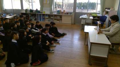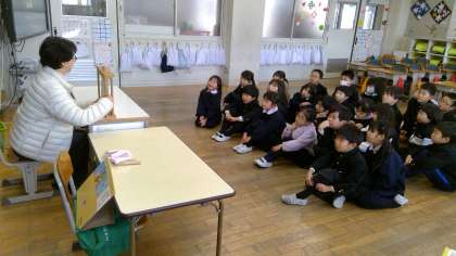朝の時間、1年生の教室に読み聞かせのボランティアの方々が来てくださいました。