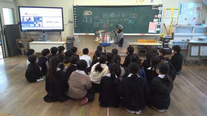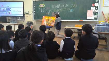 今日のお話は、大型絵本の「給食番長」と紙芝居「あんもち みっつ」というお話です。さすがは、読み聞かせボランティアの方です。「給食番長」の話は、とても、抑揚があって迫力がある読み方で、2松の子どもたちの目も見開いたままです。「あんもち みっつ」の方は、昔、テレビでやっていた「日本昔話」にも勝るとも劣らないような読み方で、子どもたちは、クスクス笑ったり、体を乗り出したりしてとても楽しんでいました。