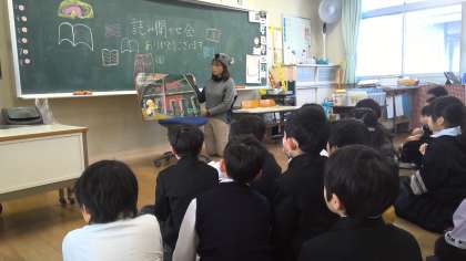 今日の朝の活動の時間。2年松組さんは、「読み聞かせボランティア」を楽しんでいます。1〜3年生の「読み聞かせボランティア」の日なのです。