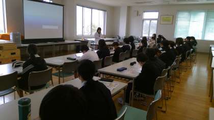2月15日(木)の3時間目に、ランチルームで「薬物乱用防止教室」がありました。薬物にはどのようなものがあるのか、使用するとどのような影響が出るのかなどについて、保健師さんが教えてくださいました。薬物には、取り返しのつかないほどの悪影響もあることを知り、もし誘われても、強い気持ちをもって断ることが大事であると再確認する、よい機会となりました。