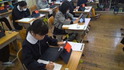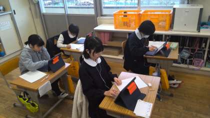 本日5年生は、「タブレットを使っての学力調査テスト」のモニターとして「テストのテスト」をしています。これは、成績には全く関係なく、5年生の復習問題として国語と算数の問題に取り組んでいます。これからは、テストもこんなふうに変わっていくのかなあ、なんて思いながら、イヤホンをつけてタブレットで解答する子どもたちを見守っていました。