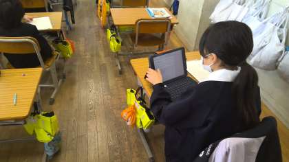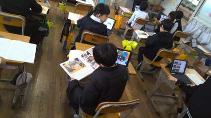 本日の1時間目。3年竹組さんは、国語の授業です。3竹さんの授業風景も今年度、今日が最終です。教室に入ると、全員がタブレットを出して検索をしています。「外国のことを調べて紹介する」というお勉強ですね。中国、イタリア、イギリス、韓国など、グループで決めた国についてインターネットや本を使って調べています。国旗とか、動物とか、建物とか服装とか…。