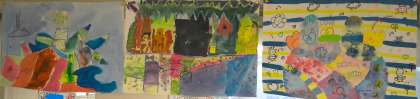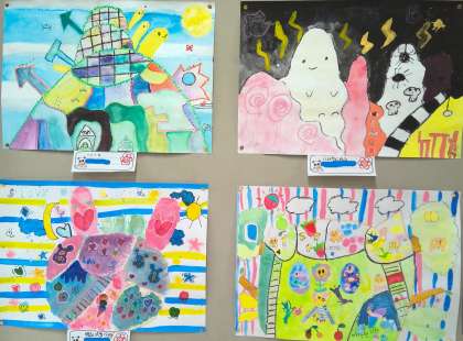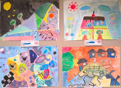 4年竹組教室に掲示している図工の作品です。授業参観の時に見逃してしまったという保護者の皆様。ぜひご覧ください。午後には、「写真集」にも掲載してアップします。こちらの方が画像は鮮明です。名前は伏せていますので、どの作品なのかは、お子様にお聞きください。