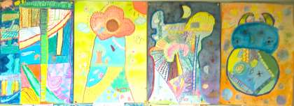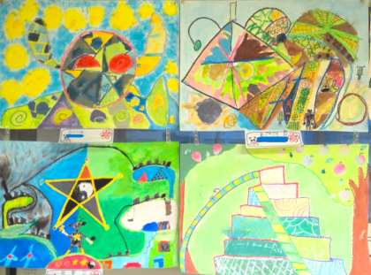 4年梅組教室に掲示している図工の作品です。授業参観の時に見逃してしまったという保護者の皆様。ぜひご覧ください。午後には、「写真集」にも掲載してアップします。こちらの方が画像は鮮明です。名前は伏せていますので、どの作品なのかは、お子様にお聞きください。