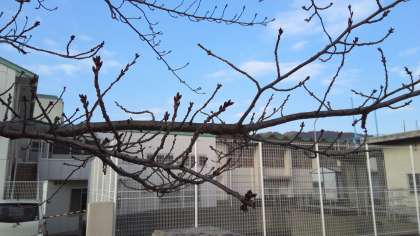 今年は、桜の開花が例年より早いというニュースを聞き、芝生広場の桜の木を見てみました。まだ、つぼみは小さかったです。昨年は、詫間小学校の桜だけ開花が遅く、そのおかげで、入学式に校庭の桜は、花がまだたくさん残っていました。今年の桜はどうなるのでしょうか?これから、「桜便り」を時々お届けします。