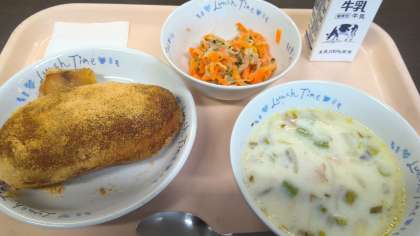私、サラダ系のにんじんは進んで食べたいと思う人ではないのですが、本校の「にんじんサラダ」だけは、心から美味しいと思いながら食べています。また、どちらかと言えば、クリーム系のスープは決して嫌いじゃないが、進んで食べたいと思う人ではないのですが、本校の「瀬戸のチャウダー」は、本当に美味しいです。「ガーリックチキン」と「きなこ揚げパン」については、おかわりができるのなら、チキンは6〜10個、揚げパンは、2〜3個はいけると思います。「にんじんサラダ」と「瀬戸のチャウダー」については、今、食べた分くらいは、おかわりできます。