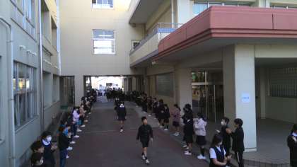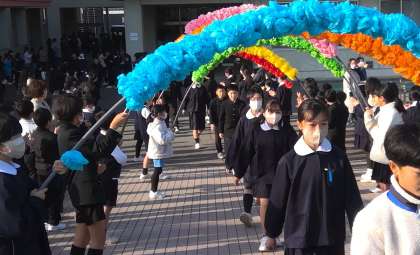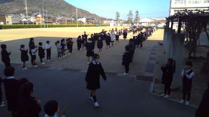 いよいよ明後日の15日(金)。卒業生90名は、保護者と並んで、南の児童玄関を出て、東館との間の通路を通って、正門から巣立っていきます。今日は、見送り隊形と、卒業生が歩く経路の確認を行いました。